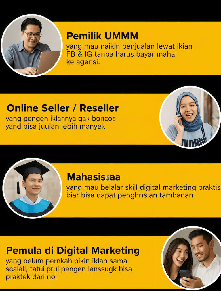 “Banyak bisnis offline masih bingung gimana cara mulai beriklan di Facebook & Instagram, padahal iklan online bisa tarik pelanggan baru tiap hari dan lipatgandakan omzet sampe 20x lipat.”
